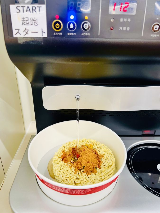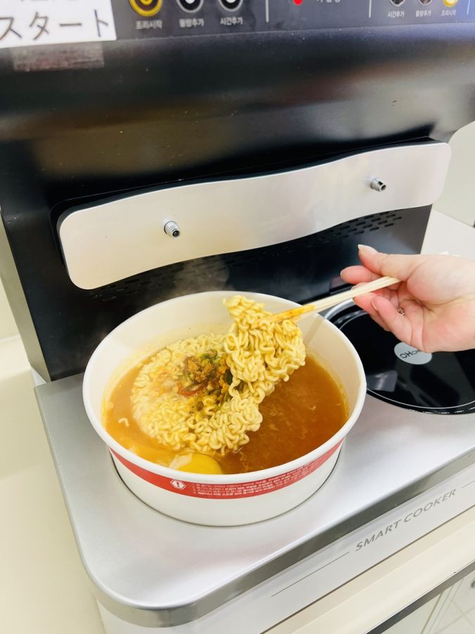店内には、イートインスペースもあり、好きなものを選んで食べることも可能。ドラマや映画の中でみた即席ラーメンを作る機械を使って自分で作っていくシステムで、韓国のラーメン文化を体験できる面白いスペースになっています。外国人観光客にも人気なので、日本語での説明もしっかり書かれているのもうれしいところ。また、24時間営業しているので、早朝でも深夜でも利用できます。