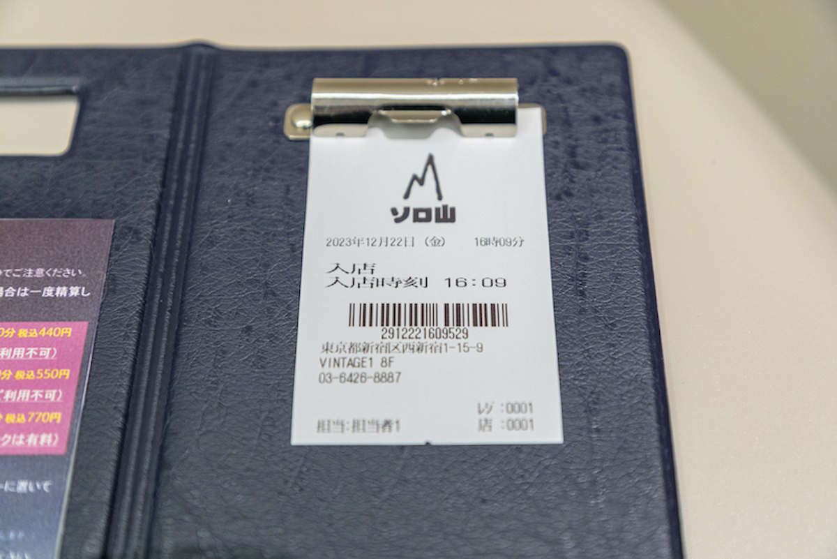 プランを決めると、入店時刻が記されたバインダーを渡されます。これがあれば、自分が今どのくらい利用しているのか一目瞭然。安心して利用できますね。