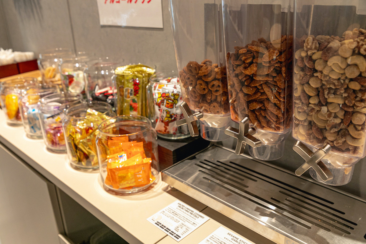 スナックコーナーにはクッキーやせんべい、駄菓子など、さまざまなお菓子が並びます。個包装されているので衛生的で、食べきりサイズなのでちょっとつまみたいときにも便利。食べたい分だけ取り出せるプレッツェルやナッツ類はお酒のお供にぴったりです。
