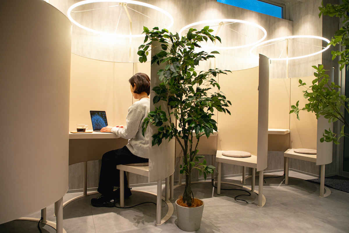 それでは各ブースを見ていきましょう。まず何ともユニークなのが半個室席。カプセルのような形で、実際に座ってパソコンを広げてみると、包まれている感じがして、とても集中できます。頭上の丸い照明もオシャレ!気分が上がります。