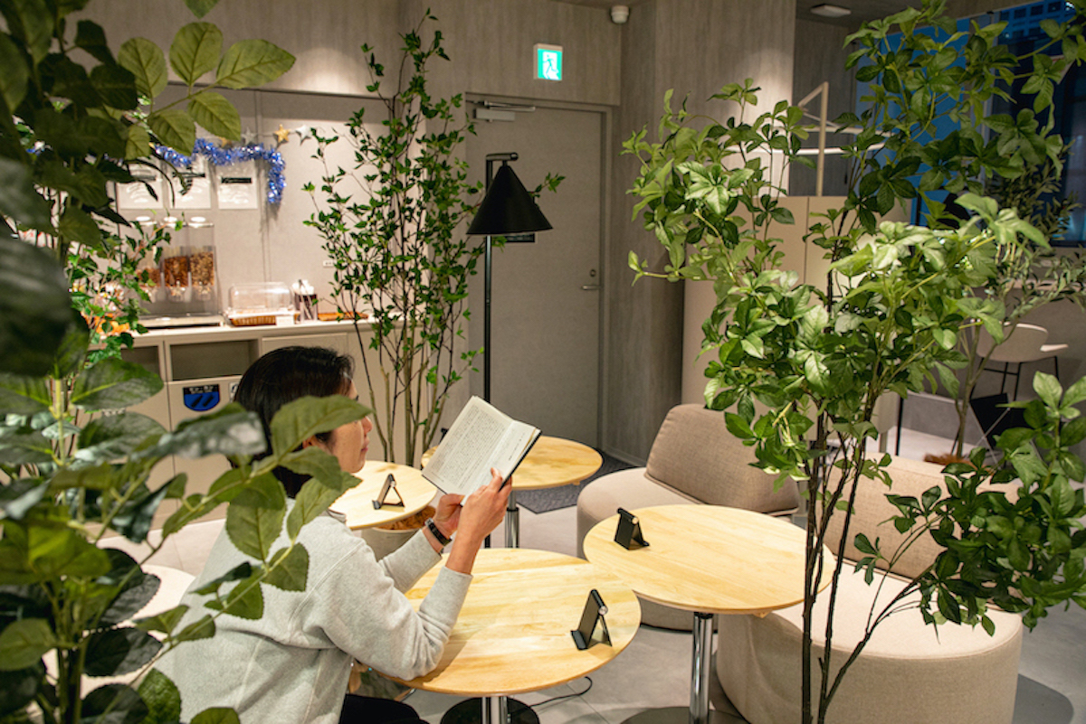 ドリンク&フードコーナーの先に広がるのが、メインフロアです。アースカラーでまとめられたモダンな雰囲気で、角のない丸みを帯びたインテリアは「一滴グループ」という社名にちなんだもの。雫が一滴一滴、波紋のように広がっていく様子を表現しています。建築家の吉田昌弘氏(KAMITOPEN)が手がけたもので、新宿という都会にいながらにして、不思議と自然を感じることができます。