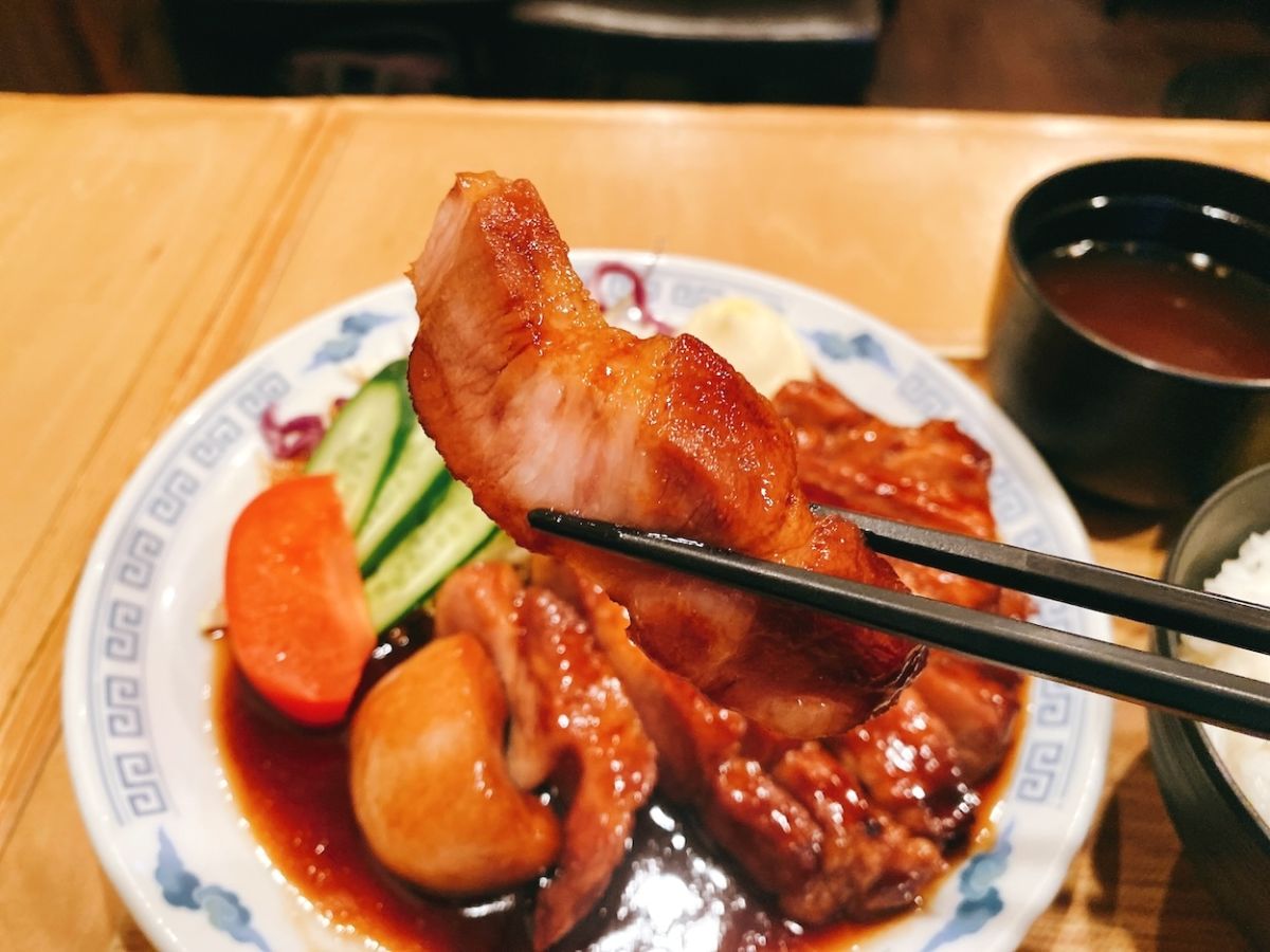タレをしっかり絡めたポークソテーをひと口。