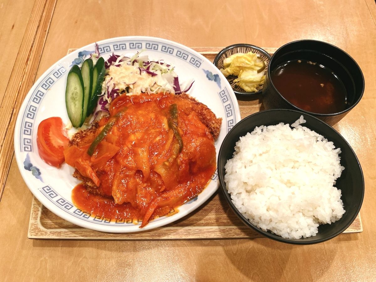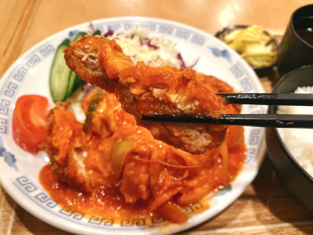 カツの衣は薄めでサクサクとしており、お肉は分厚く軟らかい食感。ピーマンやタマネギなども入ったトマトソースがさっぱりしているためお肉の脂っこさを感じにくく食べやすいです。さらに、ソースとカツの間にはさまったチーズのまろやかさにうっとり。