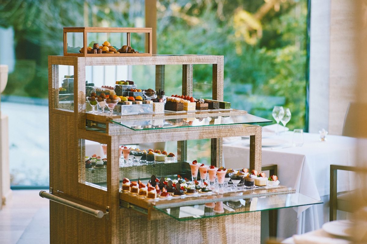 「フランス料理 ヌーヴェル・エポック」では、デザートワゴンを楽しめる平日限定のランチコースを提供。通常のデザートの代わりに、パティシエ特製のデザートワゴンを席まで持ってきてくれます。産地限定のシングルオリジンのチョコレートやリキュールなどのお酒を用いた大人のボンボンが用意されるので、この時期しか味わえないデザートを心ゆくまで堪能してみて。