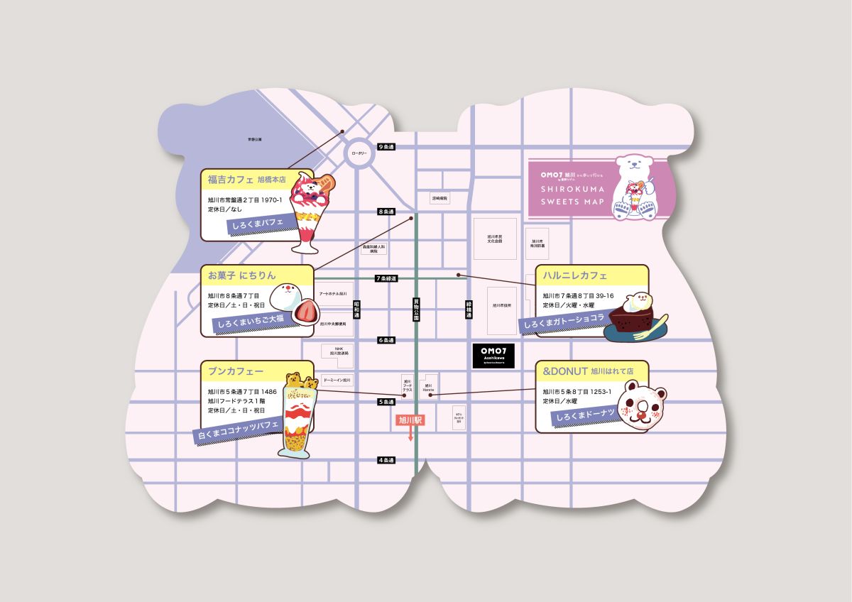 掲載されたお店はいずれもOMO7旭川から徒歩約3〜8分の距離。旭川の街ナカを探索しながら、マップを片手にスイーツ巡りが楽しめます。