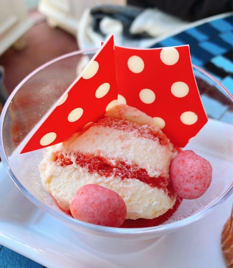 ミニーのドット柄をイメージしたアラザンとチョコを飾ったソフトクリームは、丸みをおびた形がポイント!ストロベリーの果肉入りソースの上にはクリームチーズホイップ、マシュマロがのっており、さまざまな味わいが楽しめます。