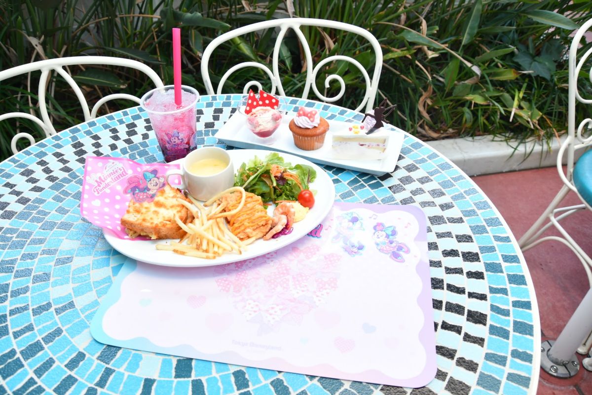 チーズをかけてオーブンで焼かれたホットサンドは、なかにパストラミとマスタード風味のキャベツがいっぱい。飽きることなく食べられます。フライドチキンにもチーズソースがかかっていて、ミニーも喜びそうなメニューのラインナップに。これにドリンクのチョイスが付きます。プレートメニューだけの単品は1760円で販売しています。