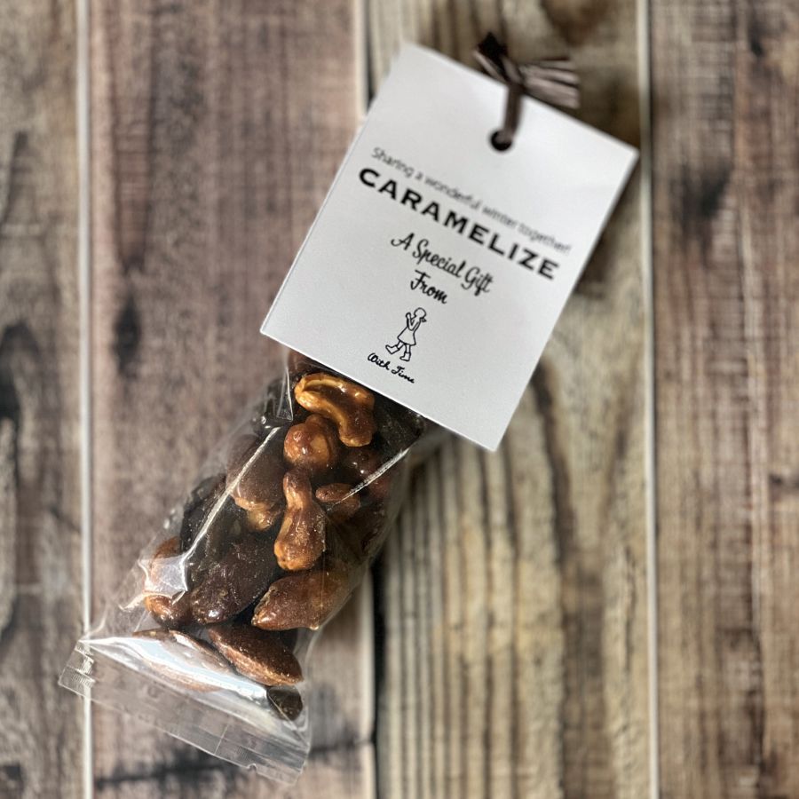 「カカオ豆とナッツのキャラメリゼ」は、ホンジュラス産のカカオ豆、アーモンド、カシューナッツを、与論島産のきび砂糖でキャラメリゼした「あちこち屋」人気No.1スイーツ。香ばしいナッツとカカオのほろ苦さがクセになる逸品です。