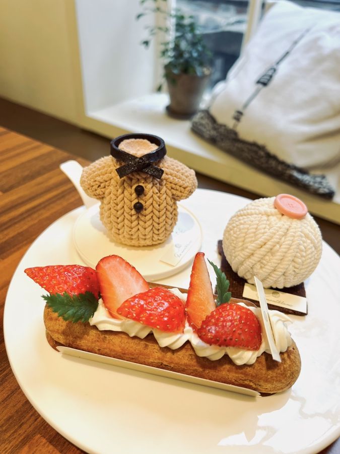 冒頭でもお伝えした通り、こちらのスイーツは見た目だけではなく、質も高いことで有名。シグネチャーとされている白い毛糸のケーキ(1万500ウォン)は、アールグレイテイストで、中はムースになっていて、大人のスイーツという感じ。そのお隣のセーターの型をしたケーキ(1万1000ウォン)は、濃厚なコーヒーテイストが楽しめるコーヒーガナッシュとなっています。手前は、イチゴエクレア(9000ウォン)で、中には濃厚なチョコレートムースが入っています。平均価格はスイーツは1万ウォン前後、ドリンクは5000〜7000ウォン程度です。