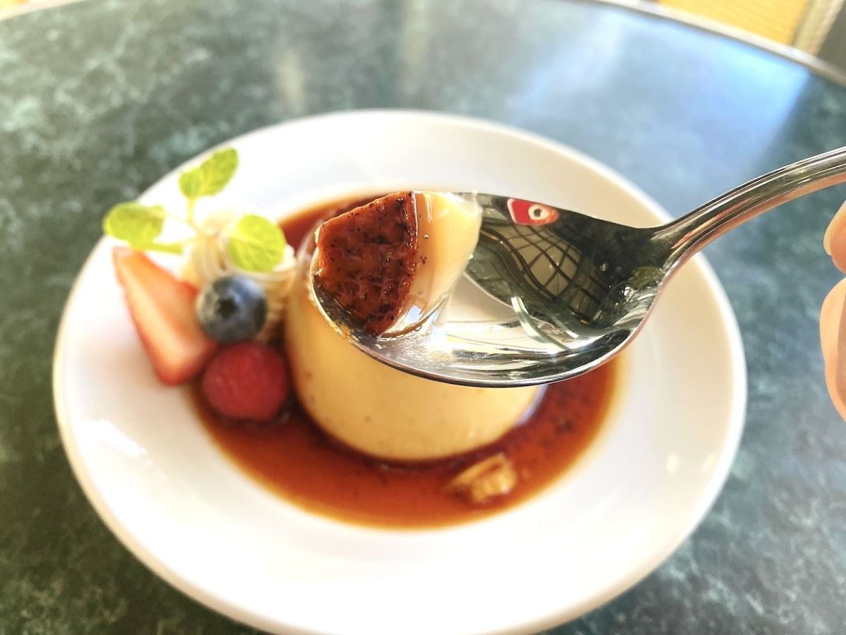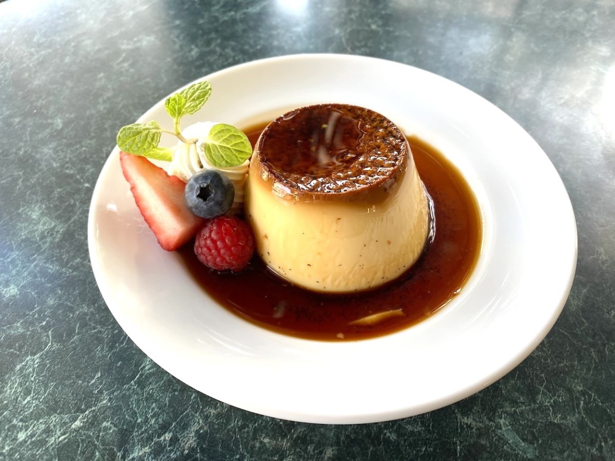 食感はクラシックスタイルのプリンのため少し硬めです。味わいはカラメルの苦さとプリンの甘さのバランスがよく、プリン好きの私は思わずうっとり。つけ合わせの生クリームやベリー系のフルーツと合わせてまた違った味わいを楽しむのもおすすめです。テイクアウトもできるので、おうちに楽しみを持ち帰ってみても。