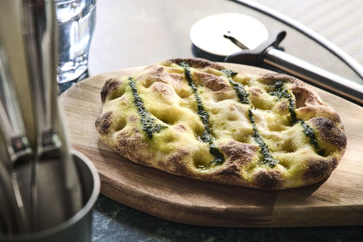 「ピンサ ビアンカ ~サルサヴェルデとローズマリーソルト~」はローズマリーソルトとサルサヴェルデがかかったピンサ・ロマーナ。香りがよく、やさしい塩気のあるシンプルな味わいのため、ペロリと1枚いけちゃいます。