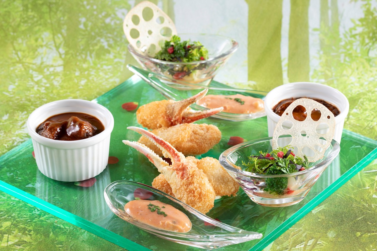 「プリンセス アフタヌーンティー ~眠れる森の美女~」は、茨モチーフのチョコレートをあしらった「いちごプリン~茨~」や、紡ぎ車に見立てたレンコンを添えた「木苺のサラダ」など、民話「眠れる森の美女」の世界観を表現したアフタヌーンティーです。
