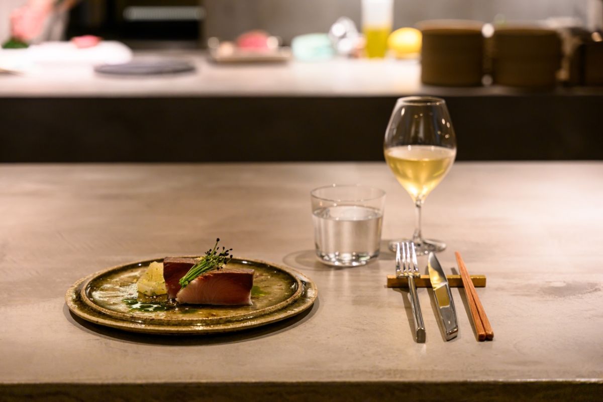 「鮮魚のミキュイと日向夏」は、新鮮な魚(取材時はブリ)に軽く火を通し、半生の状態(=ミキュイ)で提供することで、驚くほど軟らかな食感に!付け合わせは八ヶ岳のカブが添えられています。