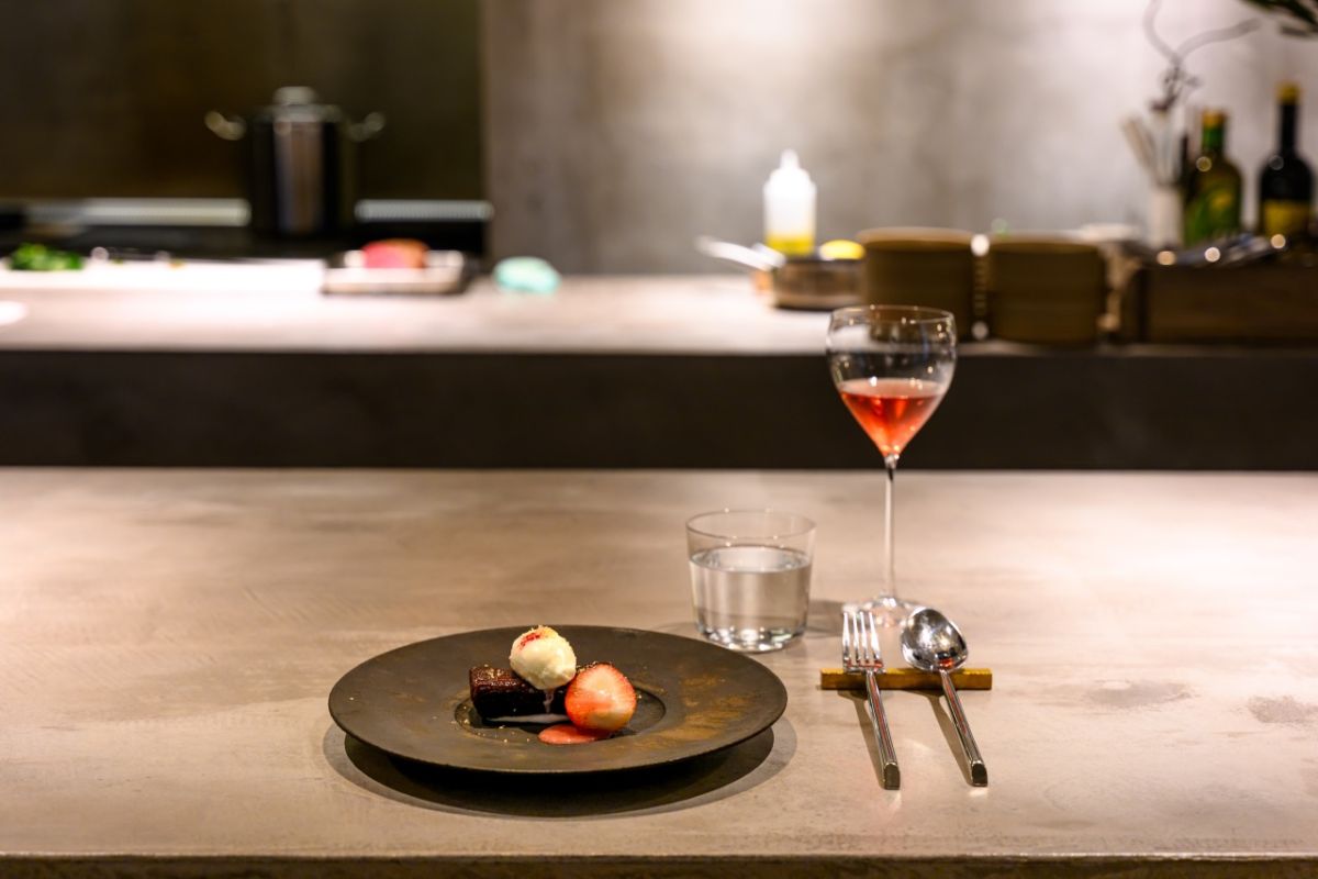 デザートは世界のパティシエたちに愛される、フランス「ヴァローナ社」のチョコレートを使用した「ヴァローナチョコテリーヌと苺」。イチゴをブレンダーにかけ、砂糖と赤ワインを入れて発酵させたソースと、濃厚なテリーヌの相性は抜群です。こちらはロゼワインと合わせます。