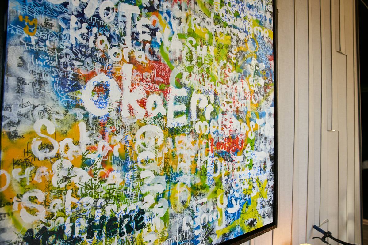 そして、ホテルに入ってすぐ目に飛び込んでくるのがこちらの「OKAERI」というアート作品。アーティストとして活動している猪本大介氏の作品で、さまざまな国の言語で「おかえり」や「ありがとう」という意味の言葉が書かれています。スタッフのフレンドリーなおもてなしも相まって、自分の居場所に帰ってきたような心地よさを感じられそう。さまざまな国のスタッフが在籍していて、マルチリンガルは当たり前という「キンプトン新宿東京」を体現したアート作品になっています。
