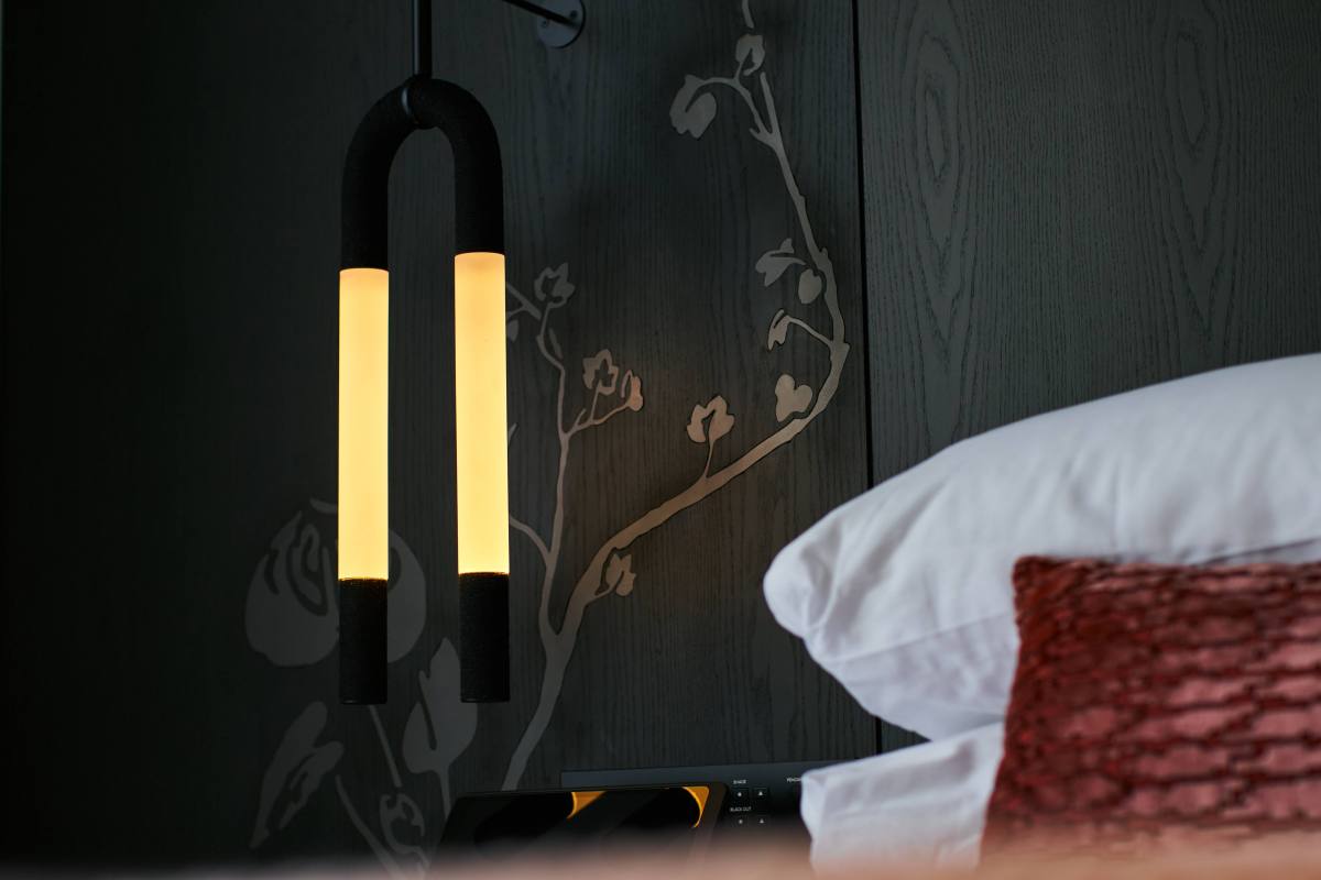 奥の照明はやわらかく温かい雰囲気の明かりが灯り、かんざしのようなデザインになっていて、とってもオシャレ…!ちなみにホテルが山梨県に続く甲州街道沿いに面していることから、エレベーターの中には連なる山々をモチーフにしたデザインが描かれています。こちらも要チェック。