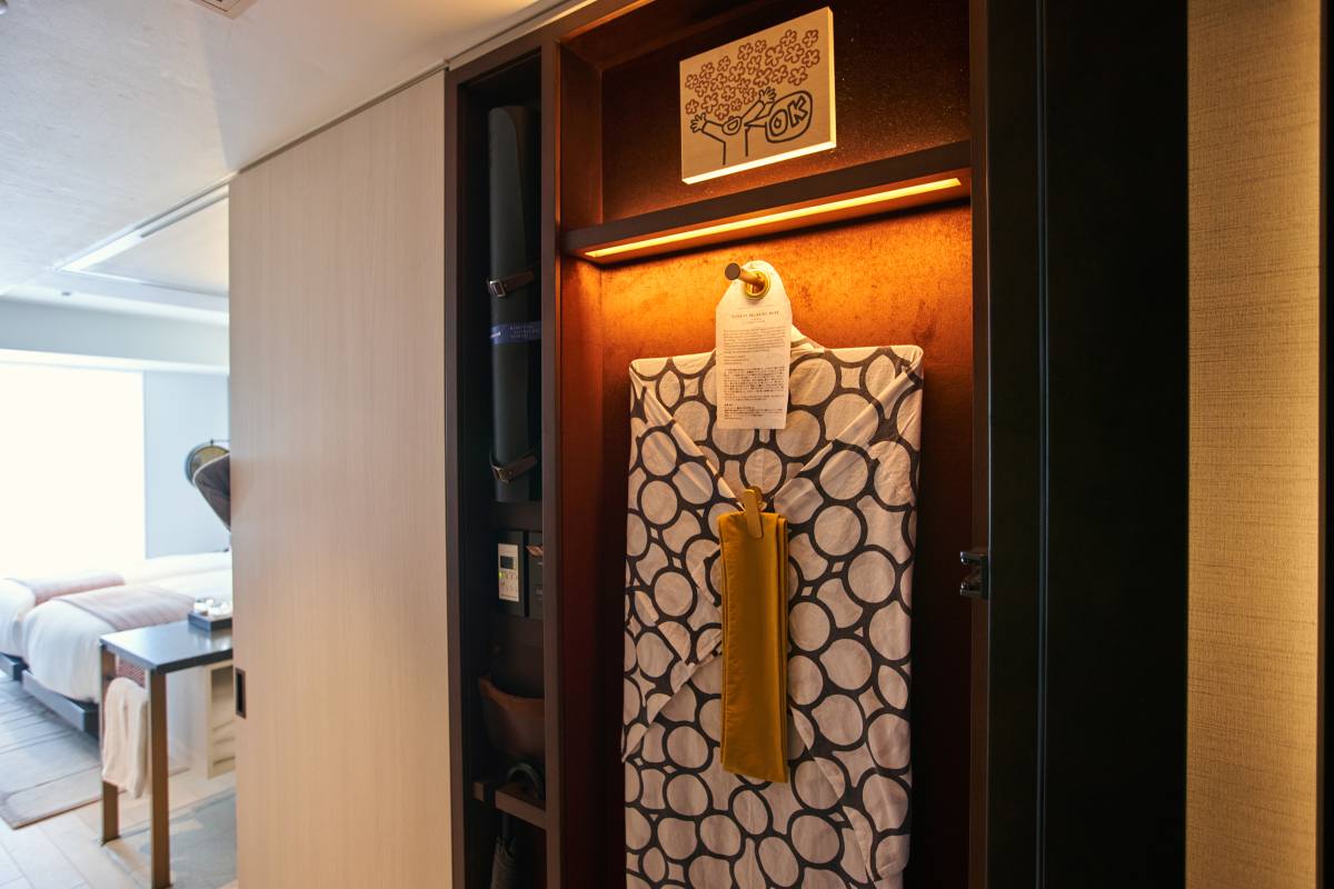 そして、客室内には室内着として性別問わず着用できる浴衣も用意されています。コロナが落ち着いた今、ゲストの約8割は海外の方だそうですが、これは海外の方にとってもうれしいサービスなのではないでしょうか。多数の円がつながる模様になっていますが、「円」=「縁」と捉えて、多くの人々がつながり、ひとつになるというイメージでデザインされたそう。