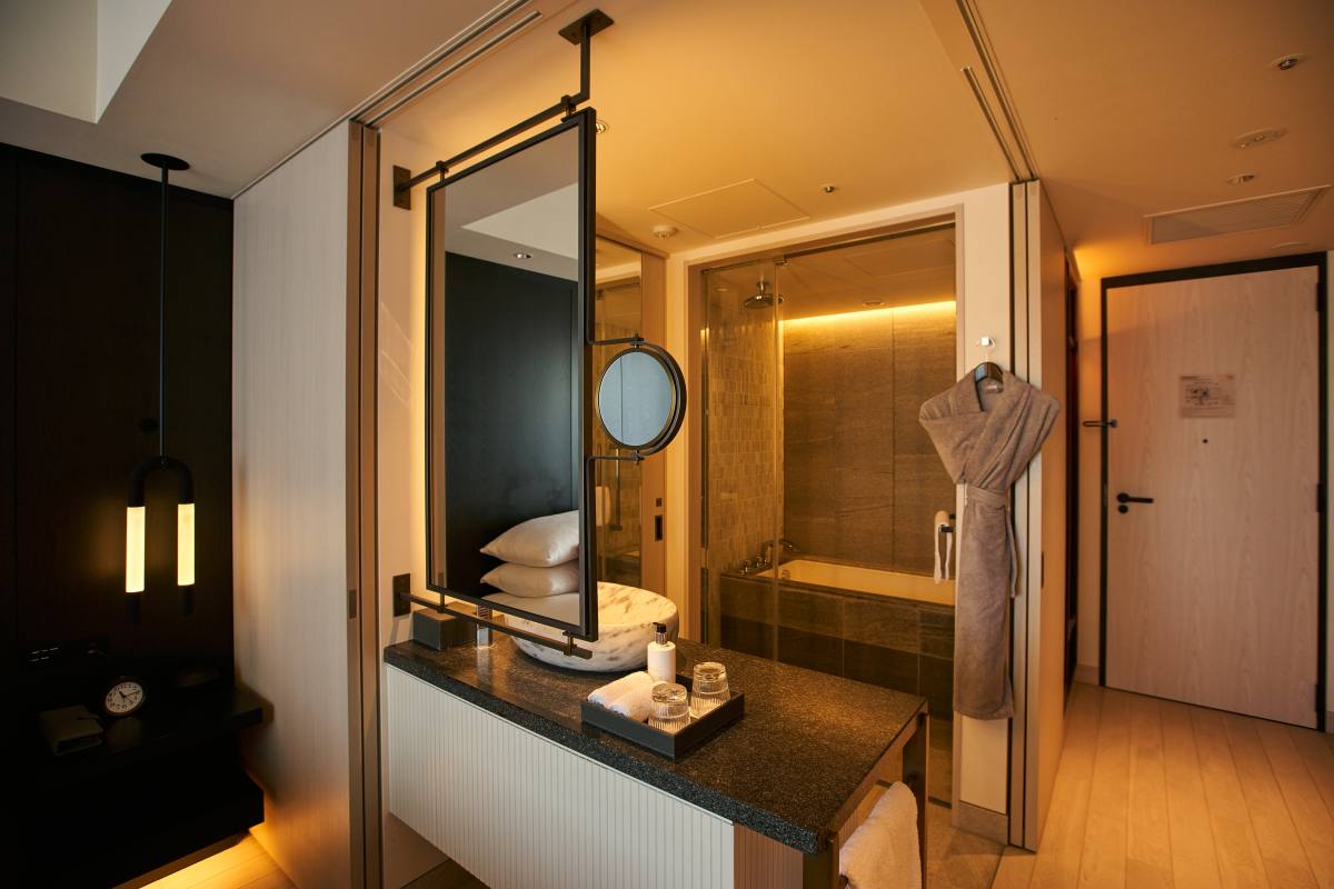 バスルームはこんな感じ。パウダースペースは室内とシームレスにつながっていて、バスルームの壁をガラス張りにすることでコンパクトな客室に広がりをもたせています。もちろん常に開け放しということはなく、木製の引き戸で閉めればプライベート空間も確保できるのでご安心を。