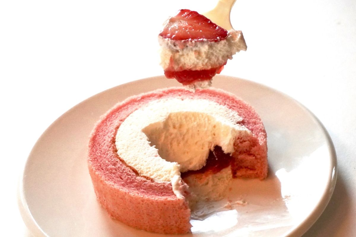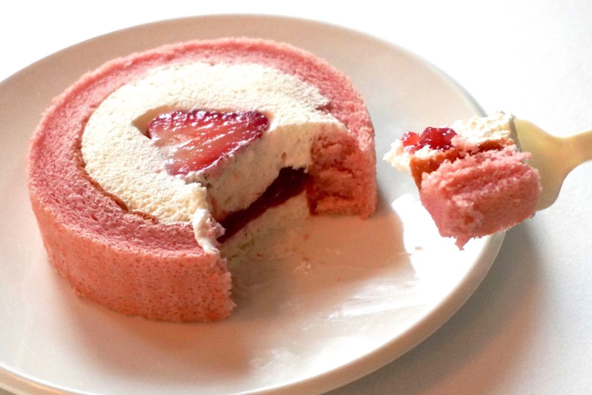 袋から取り出すと、パッケージの写真とほぼそのままのロールケーキが登場します。今年の「いちごのロールケーキ」は、スポンジがかわいいピンク色。真っ白なホイップクリームとのコントラストがきれいで、真ん中にカットされたイチゴが埋まっています。このキュートなビジュアルが、いち早く春を呼び込んでくれているようです。