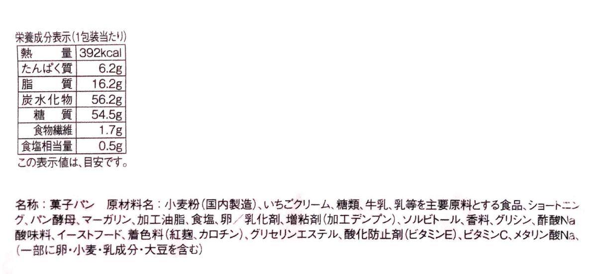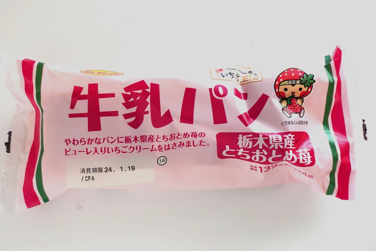 ピンク色で、ちょっとレトロなパッケージにひかれて、手にとってみた「牛乳パン 栃木県産とちおとめ苺」150円。関東地域限定です。