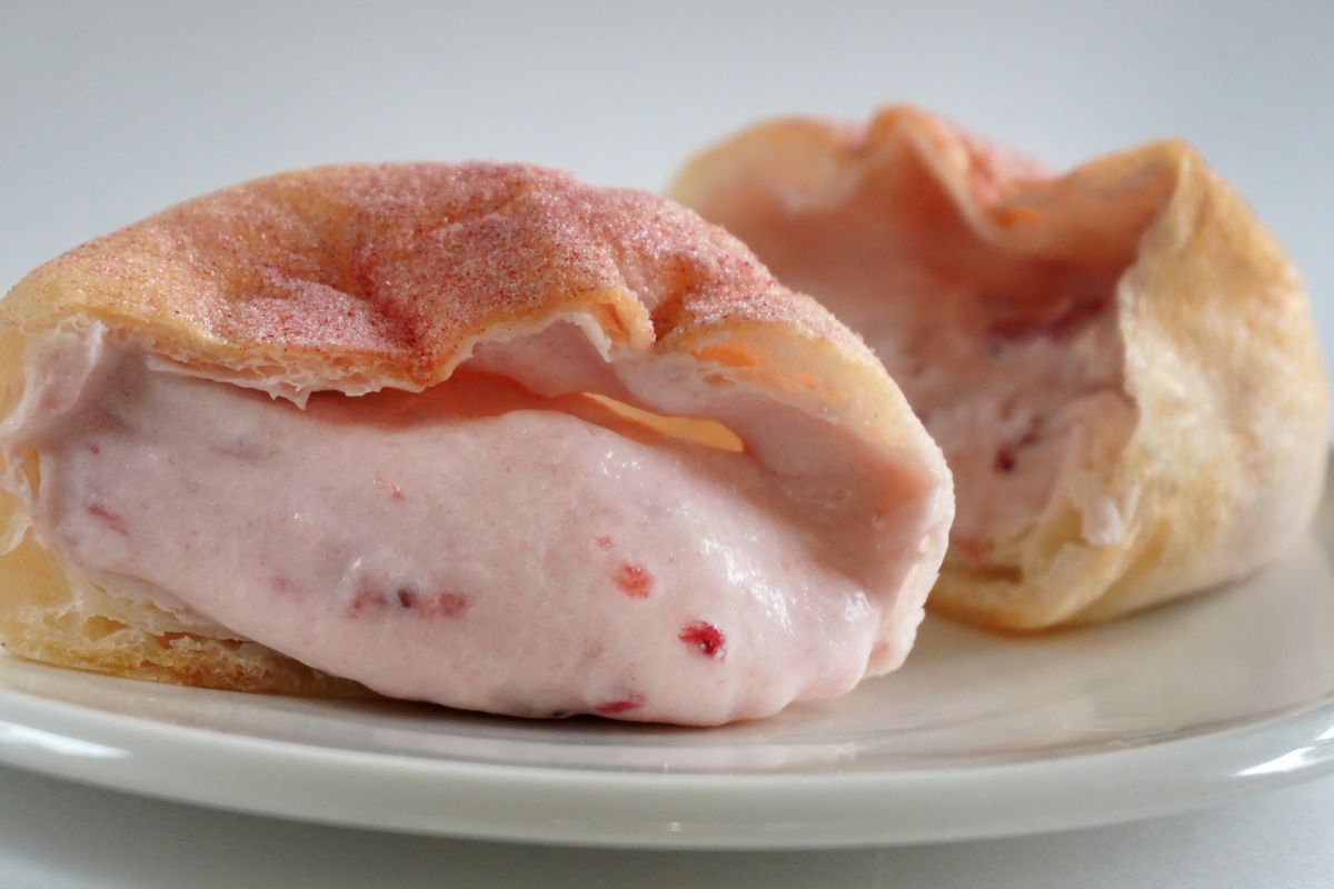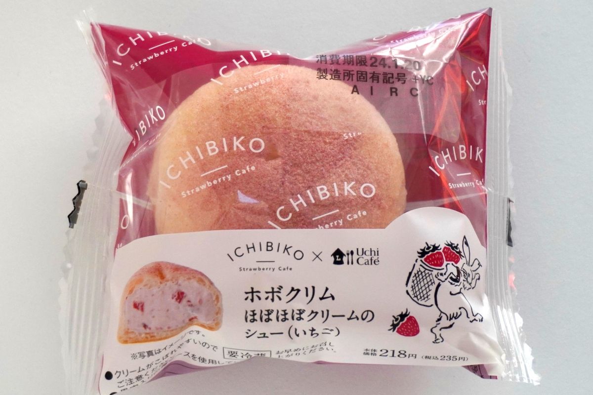 2024年1月9日には、イチゴスイーツ専門店「ICHIBIKO(いちびこ)」とUchiCaféのコラボ商品がスイーツやパン、お菓子、アイスなど18品も登場しました。その中のひとつが「ホボクリム ほぼほぼクリームのシュー(いちご)」235円。