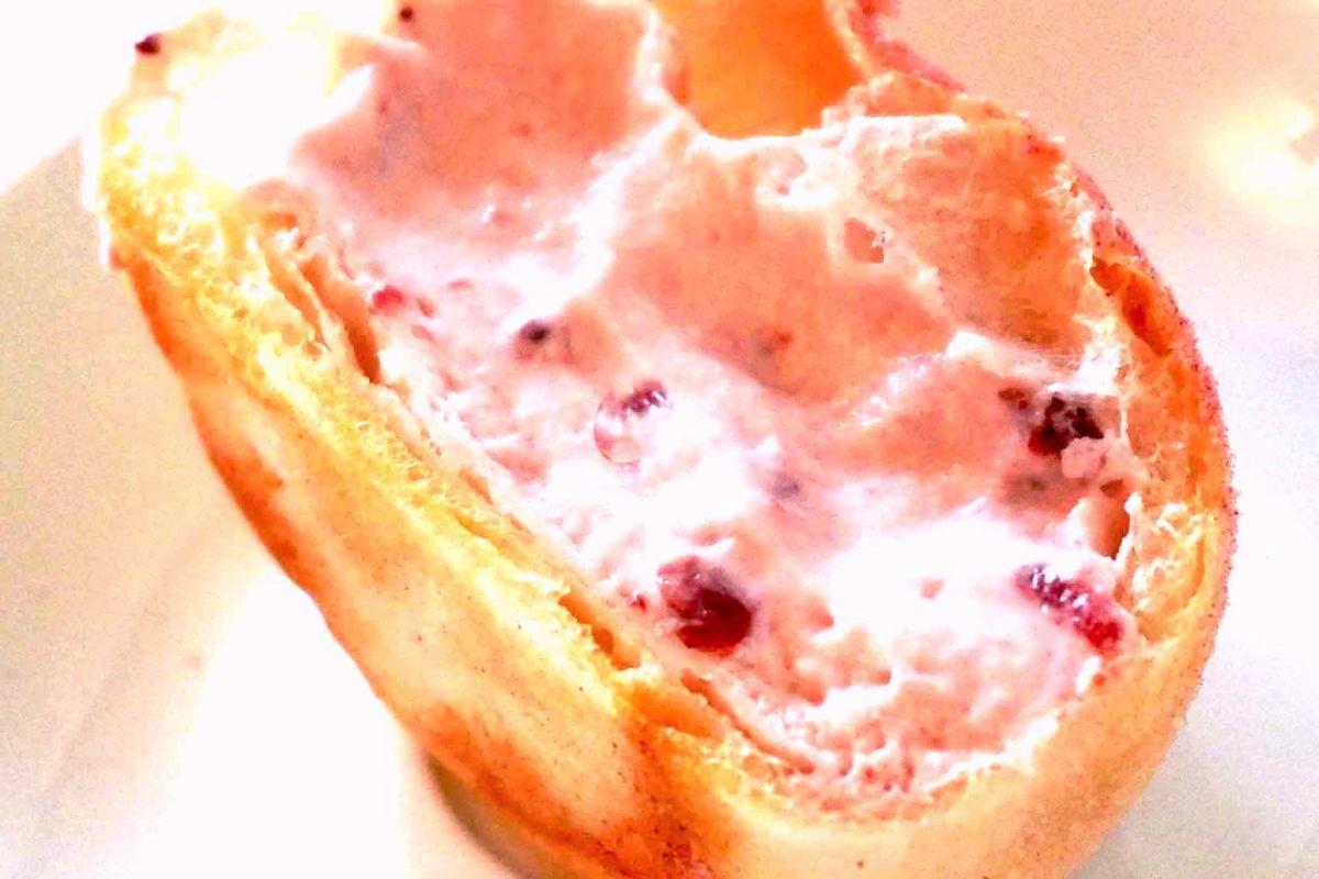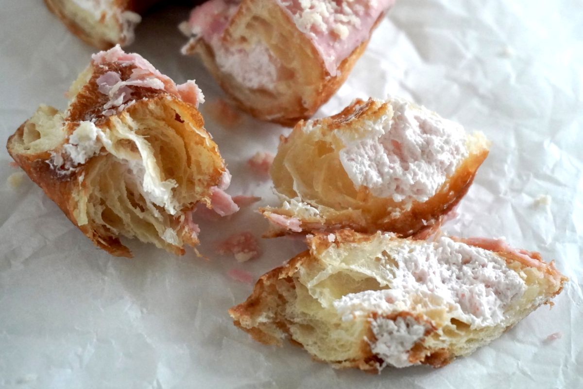 半分に切ってみました。生地は層になっていて、クロワッサンそのもの。その間に、淡いピンク色のホイップクリームが入っています。