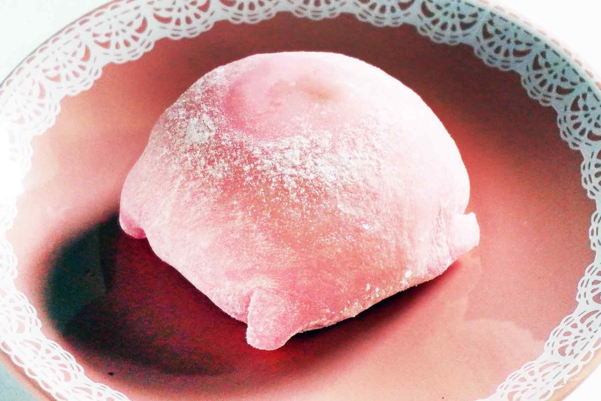 表面はピンク色で、すべすべ&もちもちの求肥で包まれています。この求肥は、京都銘菓「おたべ」のメーカーの求肥を使用しているとか。求肥はお布団のように、ふんわりかかっているという状態ですが、その中はいったいどうなっているのでしょう?