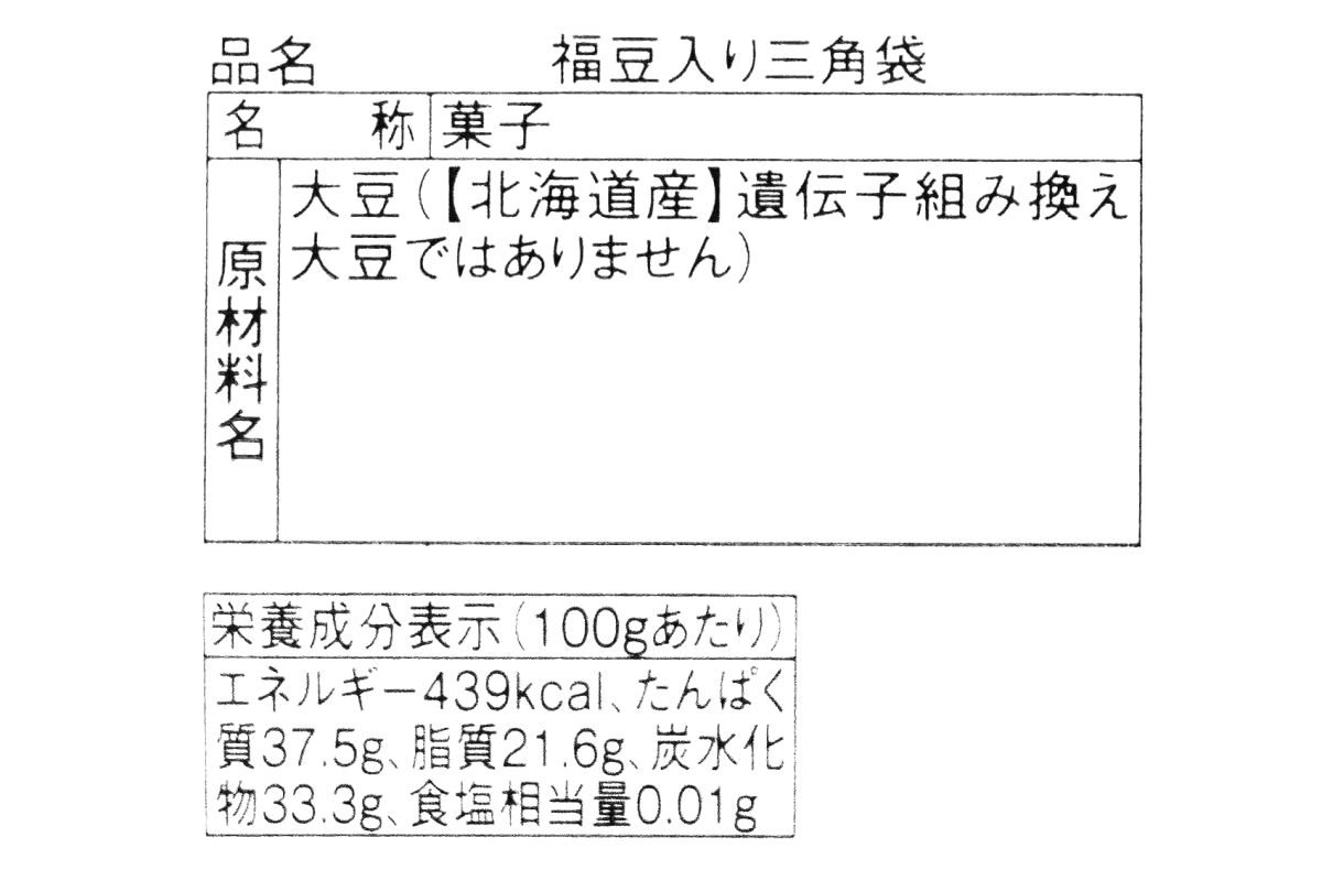 「福豆入り三角袋」は、外袋を開けた途端、煎った大豆のすごく香ばしい香りが立ち上ります。これには、ちょっとびっくり!!