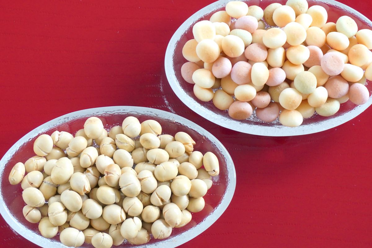 赤鬼の顔の中には煎った大豆と、大豆と同じような大きさで、ふんわり色づいた桃色や緑色のぼうろが入っています。