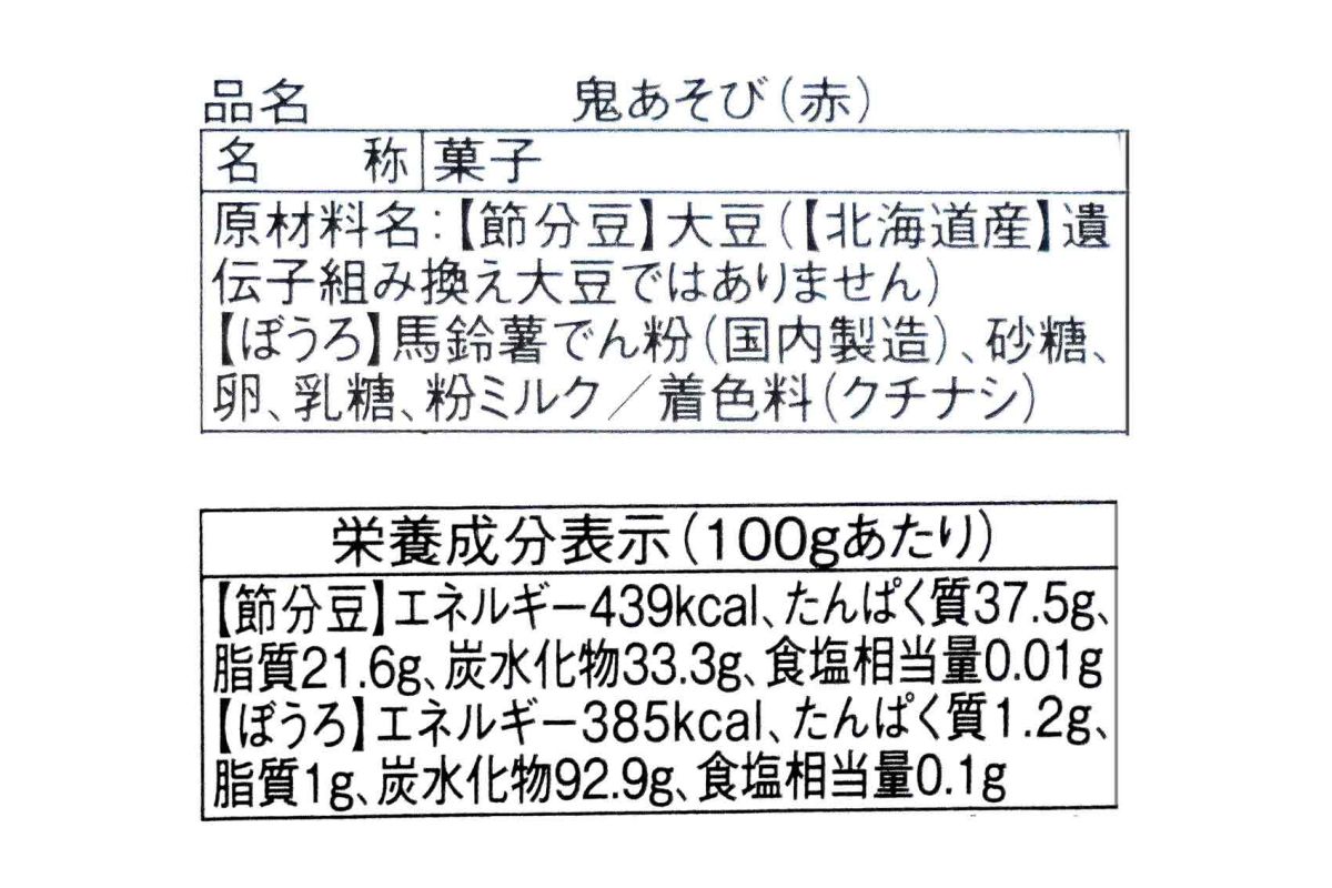 内容量は節分豆40gで、エネルギーは175.6kcal。ぼうろ25gで、エネルギーは98.25kcalです。
