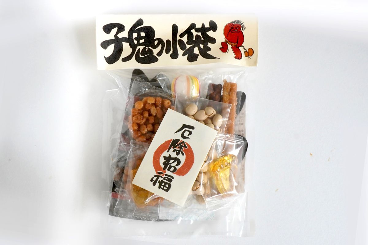 厄除招福のお札や鬼のお面、いろいろなお菓子がセットになった「子鬼の小袋」648円。