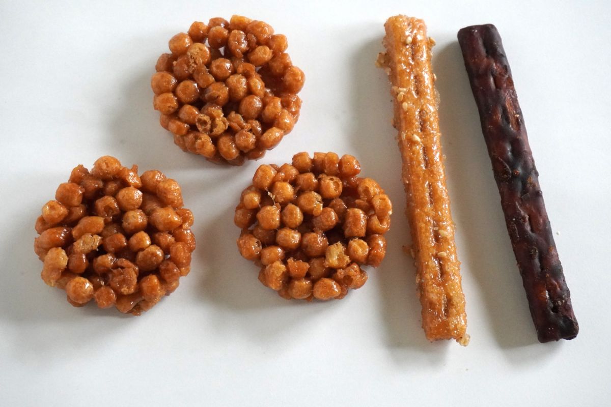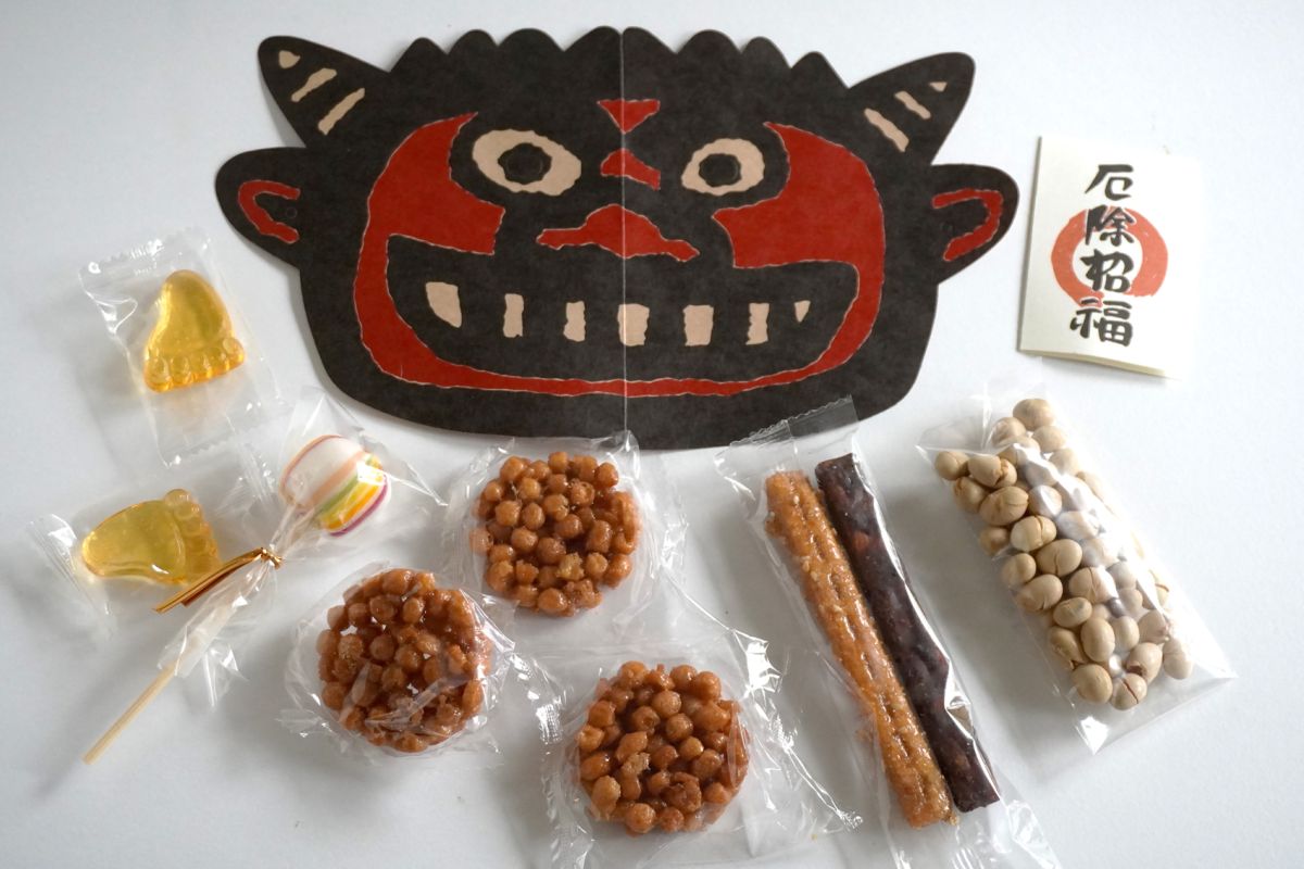 左は鬼の太鼓をかたどった「鬼さん太鼓」。大豆ほどの大きさのかりんとうを、水飴で丸く固めたものです。