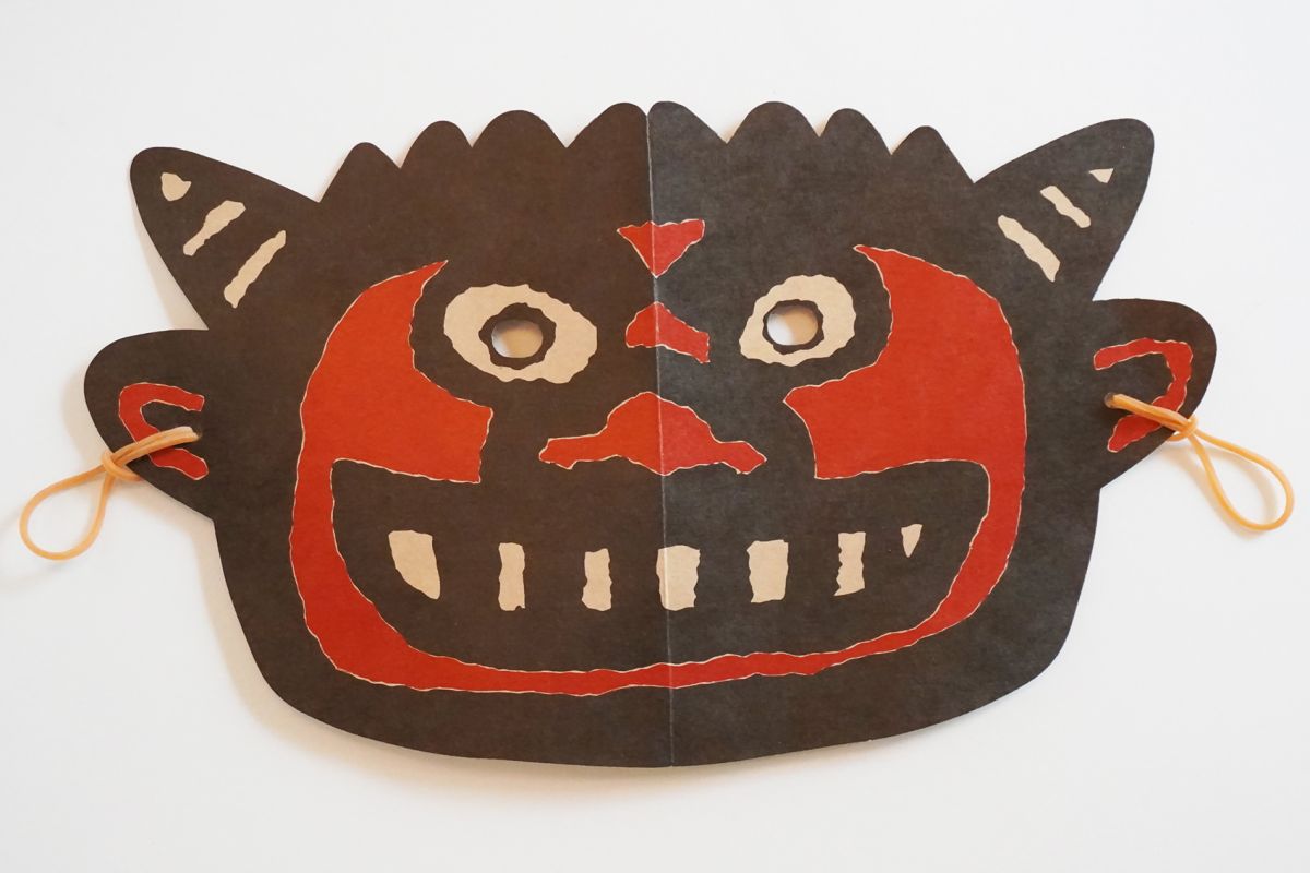 紙でできた鬼のお面。節分の間、どこかに貼っておいてもよさそうですが、目と耳の部分がくり抜けるようになっているので、実際にお面として使えます。童心に帰って、遊ぶのもいいかもしれません。誰かにつけてもらって、豆をぶつけてみるのもアリ?