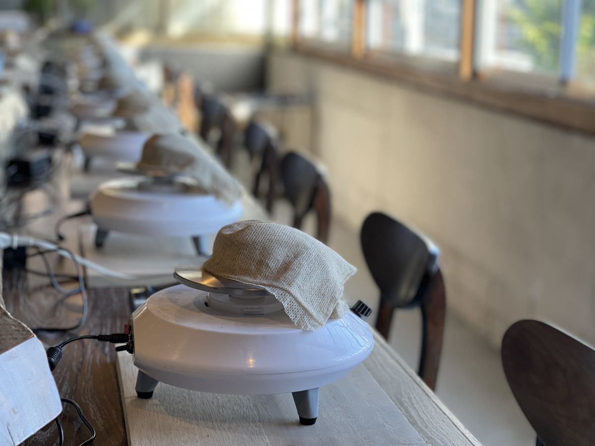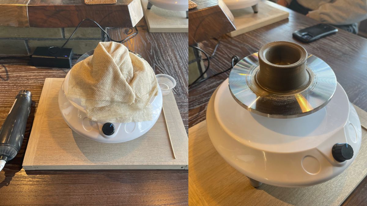 席には小ぶりのろくろと、ドライヤー、水、竹串が用意されています。ろくろの上には布巾をかぶせた土が。器が作りやすいように事前にある程度形が整えられているので、初心者や不器用な人でも安心です。