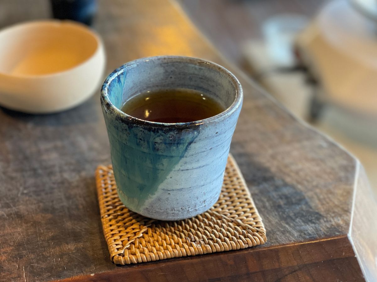 慣れない空間にそわそわしながら席に着くと、まずはお茶のサービスが。温かいお茶で緊張がほぐれたところで、いよいよ陶芸体験のスタートです。