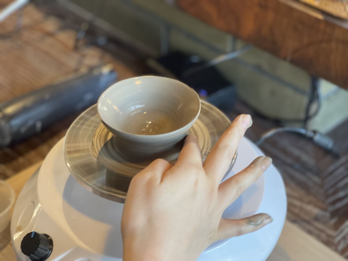 指の使い方がわかったところで器の厚みを薄く調整してみます。わずかな指の角度や力加減で簡単に形が変化してしまうので、少しずつ慎重に調整。気が付くと頭の中が空っぽになるほど作業に集中していました!