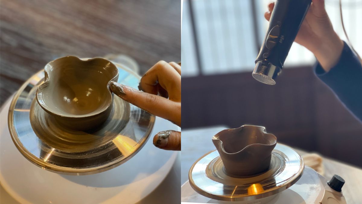 最後の仕上げに花びらをイメージしたくぼみをつけて、ドライヤーで土を乾かします。なんと、くぼみをつけるのは一発勝負で修正ができないとのこと。スリルも味わいながら器作りを楽しみました。