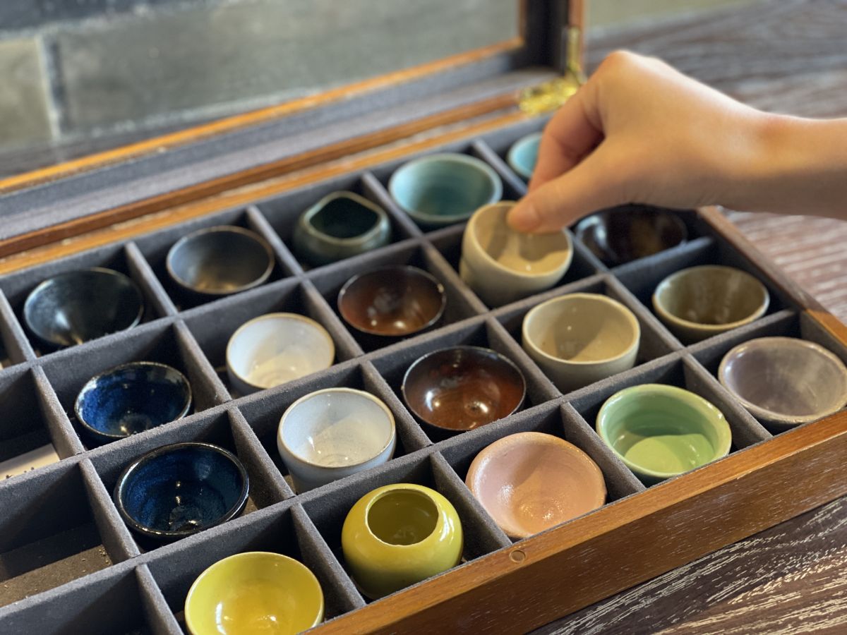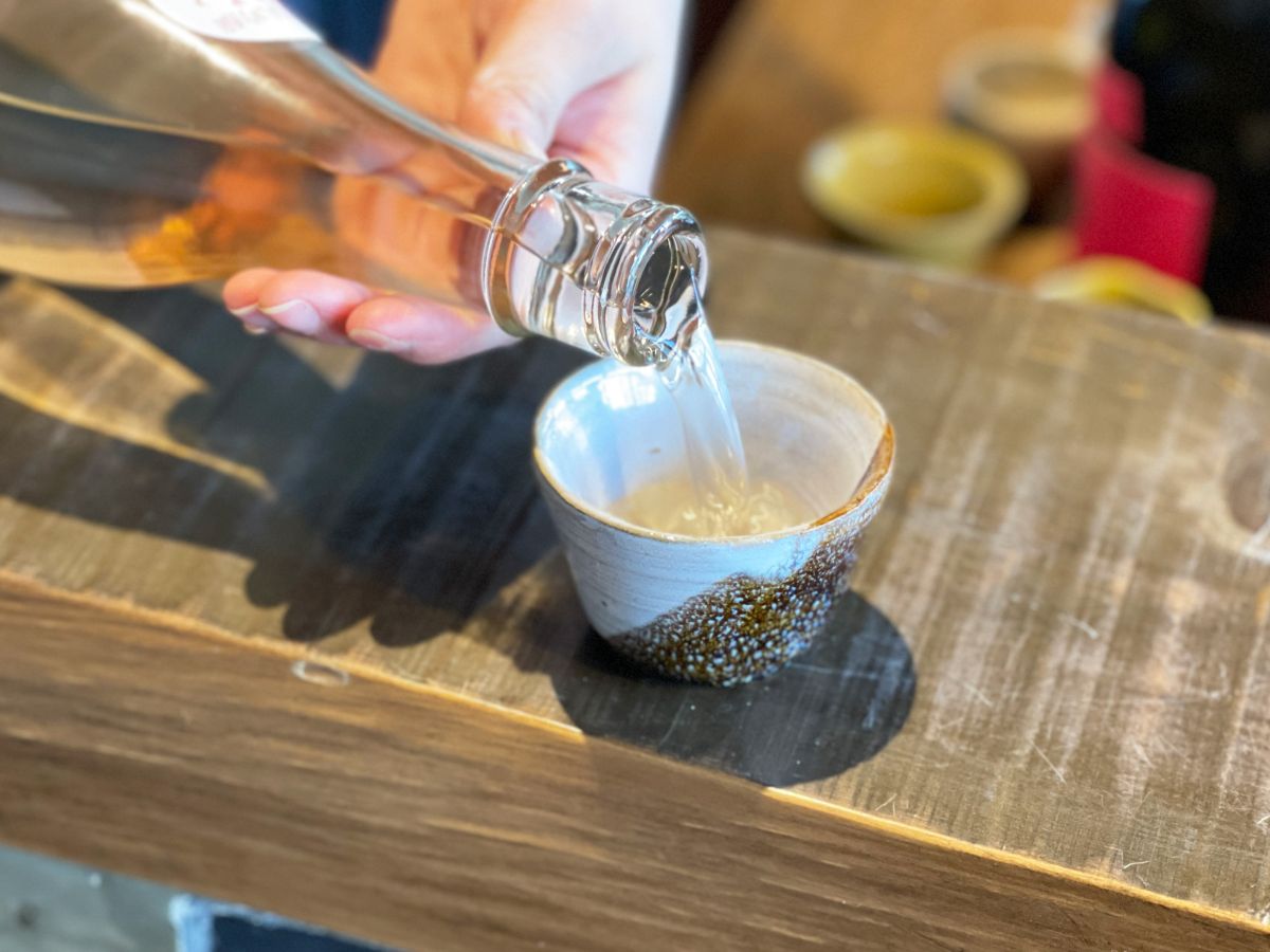 できあがるのを少し待つ間、スタッフ手作りのお猪口で日本酒をカジュアルに楽しむのがおすすめです。日本酒は食事に合うテイストや飲みやすさにこだわったユニークな銘柄を揃えているそう。その時々で種類が変わるので、スタッフにおすすめを尋ねてみてください!