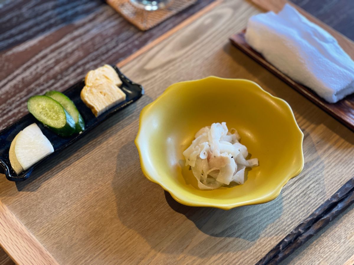 ドリンクをいただきつつ、前菜の「大根と生ハムと湯葉の和物」を楽しみます。スライスされたみずみずしい大根と塩味のある生ハム、まろやかな湯葉がマッチし、やさしくさっぱりとした味わい。メイン料理へのわくわく感も高まります。