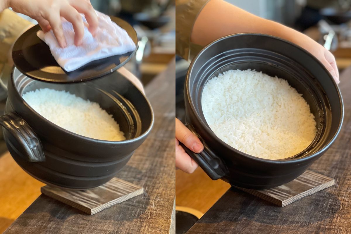 いよいよご飯が炊きあがると、スタッフが土鍋を開けて見せてくれました。「ろくろと米 ととと」では米にこだわり、ランチでは福岡県産ヒノヒカリを使用。コシヒカリの味を強く引き継いでいて、バランスの取れた食感と甘みが特徴なのだそう。