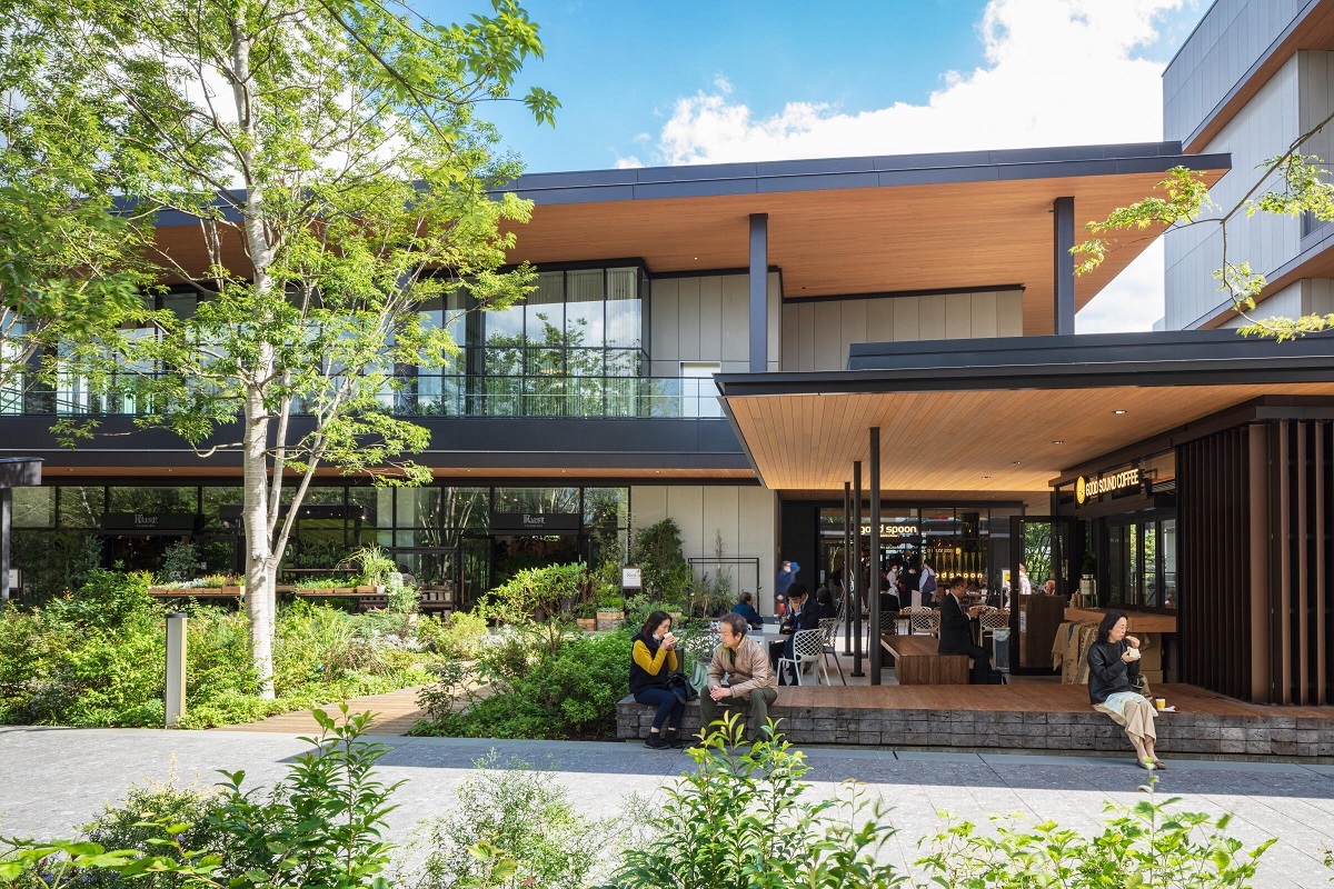 立川駅北口から徒歩8分、健康的なライフスタイルをテーマにしたウェルビーイングタウン。パブリックアートが点在する緑豊かな広場を中心に、ショップやレストラン、多目的ホール、ホテル、オフィスなどを配置。建物の軒天井や広場のベンチなどに、多摩産材が使われています。