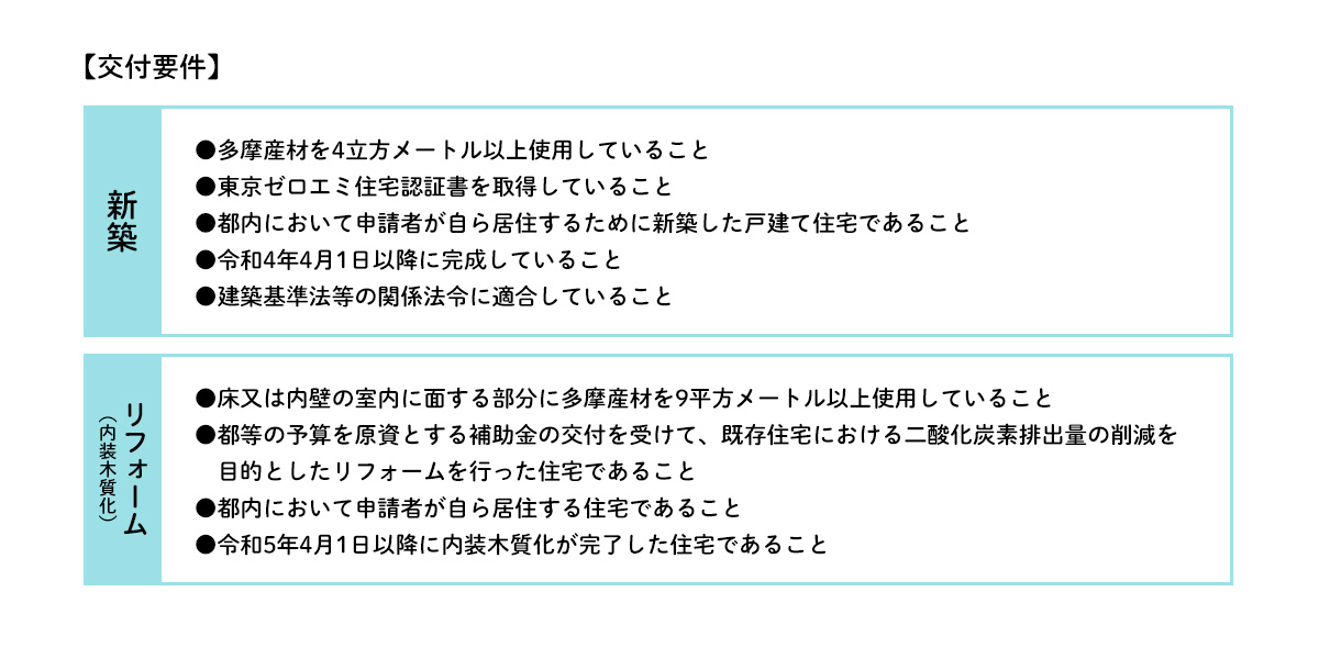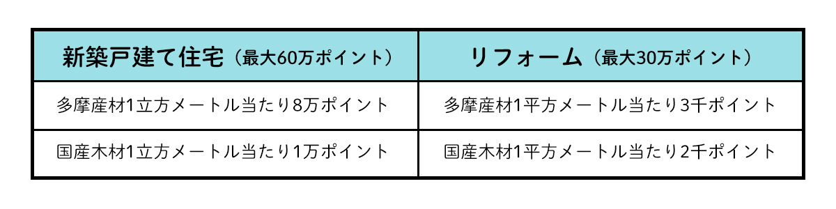 ちなみに、4人家族で暮らす際のおおよその目安といわれる120平方メートル(約36坪)の住宅を新築するのであれば、1戸当たりの木材使用量は約24立方メートル。交付要件は余裕でクリアでき、「東京の木 多摩産材」なら最大60万ポイントもらえるということに♪