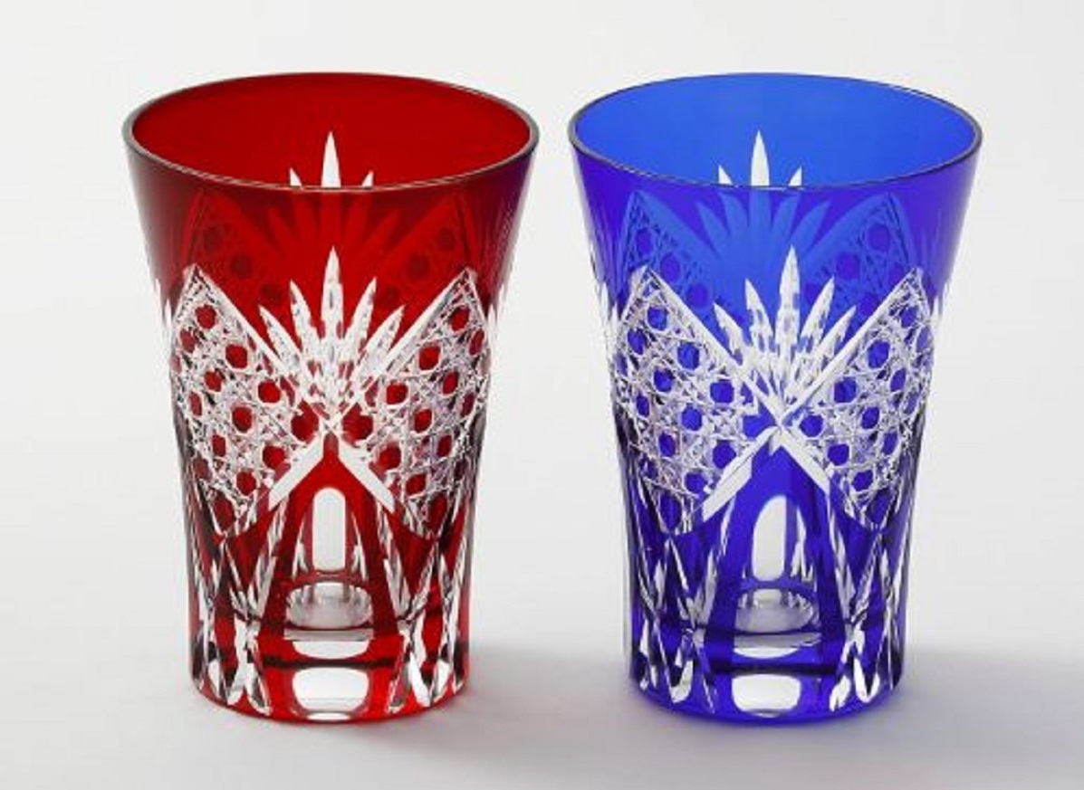 職人技による深いカットが華やかな江戸切子は、東京が誇る伝統工芸品の一つ。「六角籠目」は竹かごの網目を模した魔除けのシンボルです。江戸切子の商品はほかにもいろいろ揃っていますよ。