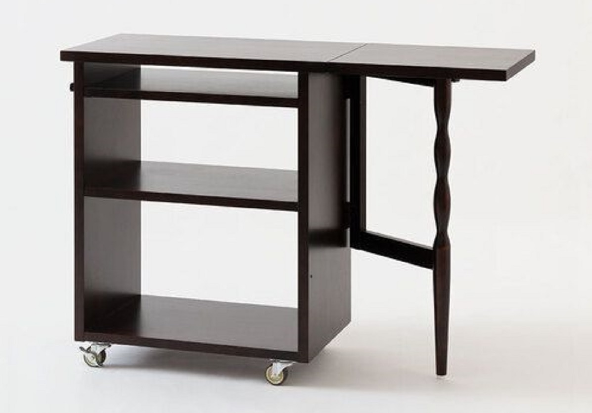 キャスター付きで楽に移動できる、国産カバ材のワゴン。ラインが美しい支柱で開き天板を広げると、作業台が67センチから105センチに。台所まわりはもちろん、仕事場でも使えるシックなデザインです。