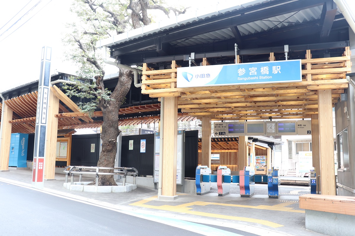 新宿駅から2つ目、小田急線参宮橋駅。明治神宮の小田急線最寄り駅として、「木と緑に溶け込む『杜』の玄関口」をコンセプトに、2020年にリニューアルされました。ホーム上家の柱や天井面、改札口上部などに多摩産材を活用し、神社建築の垂木や組木をモチーフに取り入れています。