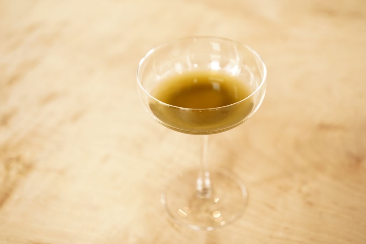 続いて供されたのは「抹茶チョコレート」。固形のチョコレートを想像していましたが、登場したのはカクテルグラスに入った抹茶色のドリンク。