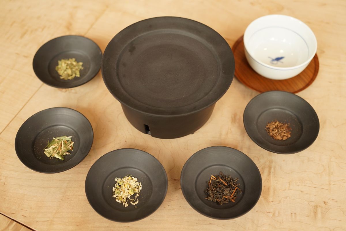 食事の最後は、あたたかい野草茶を飲んでホッとひと息つきましょう。香り高い薪火晚茶(まきびばんちゃ)、和紅茶、カモミール、レモングラス、ビワの葉、5種類の茶葉が並びます。素材はすべて国産。それぞれの茶葉の香りを楽しんだ後、5つをブレンドして、茶香炉(ちゃこうろ)で焙じます。