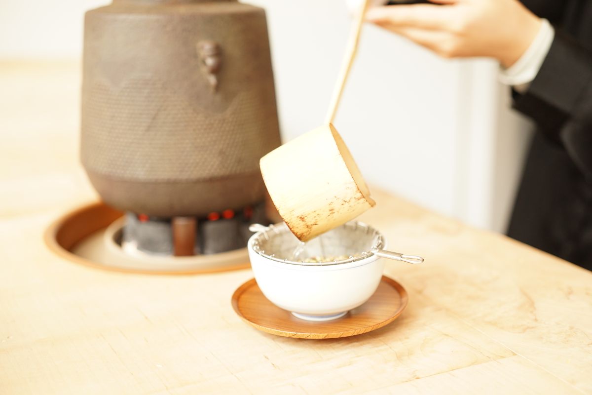 店員さんが丁寧に茶葉を漉してくれる様子は見ているだけでも癒やされます。最後にお茶を出すのは、香りでこのコースの記憶を残してもらうため。お茶は日本に上陸して1300年以上が過ぎてもなお、日本人の生活の中で息づきます。同じように、Minimalも長きに渡って愛され続けるお店を目指しているのだそうです。