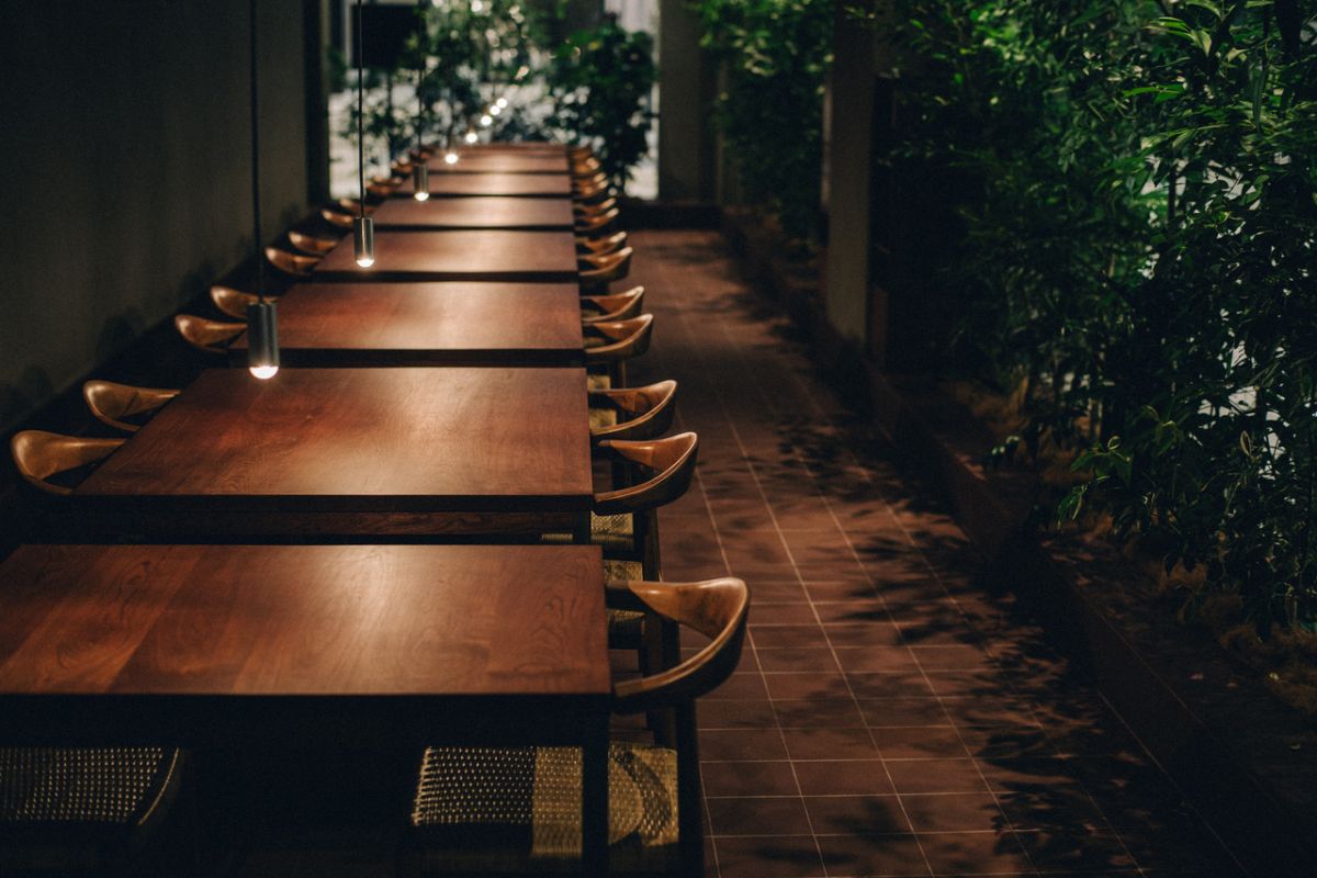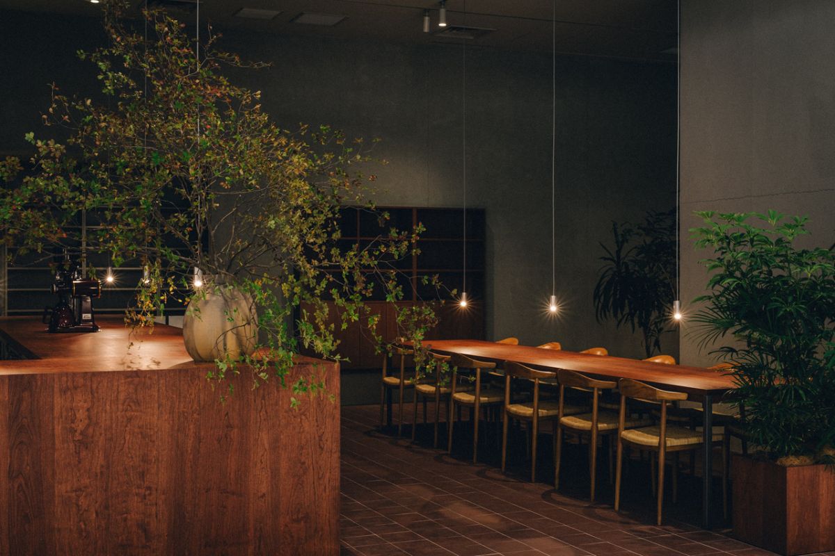木製のテーブルとチェアに、店内に飾られたグリーンで統一感のあるおしゃれな店内。温かみのある照明で雰囲気抜群です。奥行きのある造りで、ずらりと一列にテーブルが並びます。