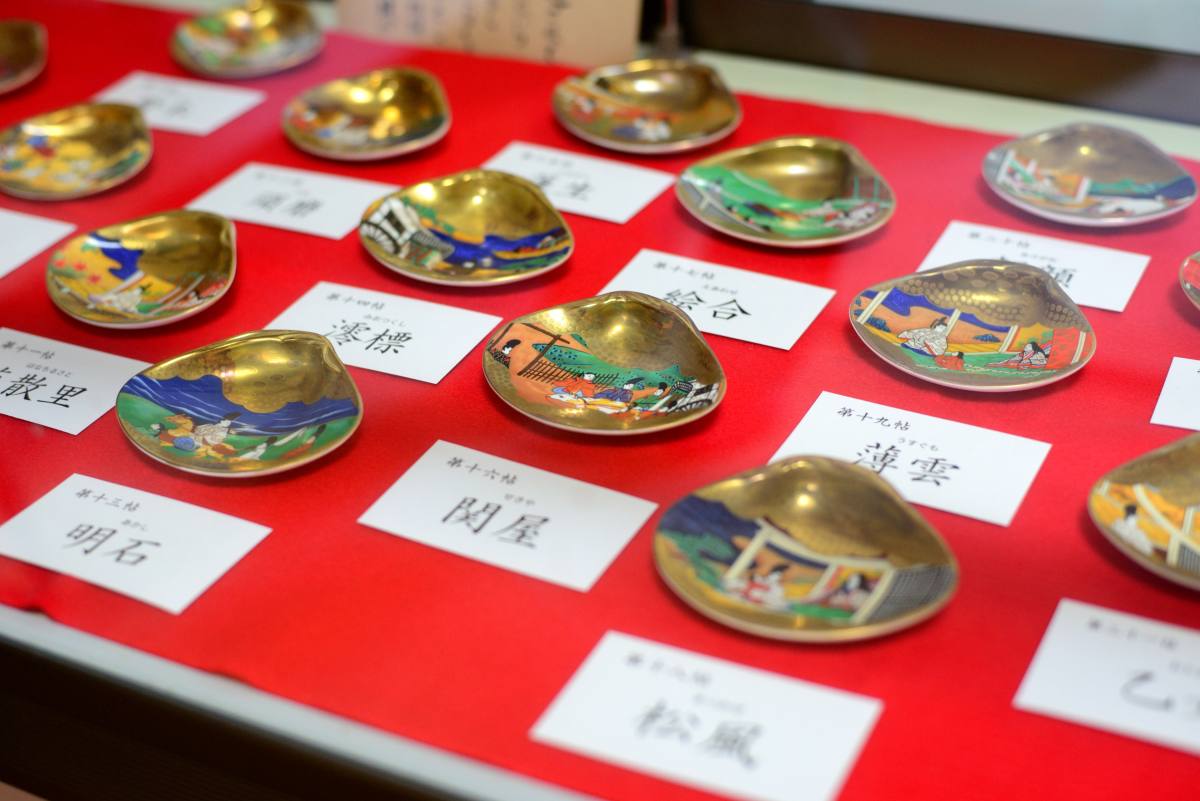 御仏殿には、百人一首や『源氏物語』の場面が描かれた貝合わせが展示されています。貝合わせとは、左右2片のハマグリの貝殻に花や歌などを書いて左右に分けて置き、絵柄を合わせる平安時代に宮中で行われていた遊びのこと。細部にまで綿密に描かれた美しい世界観に思わず目を奪われます。